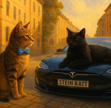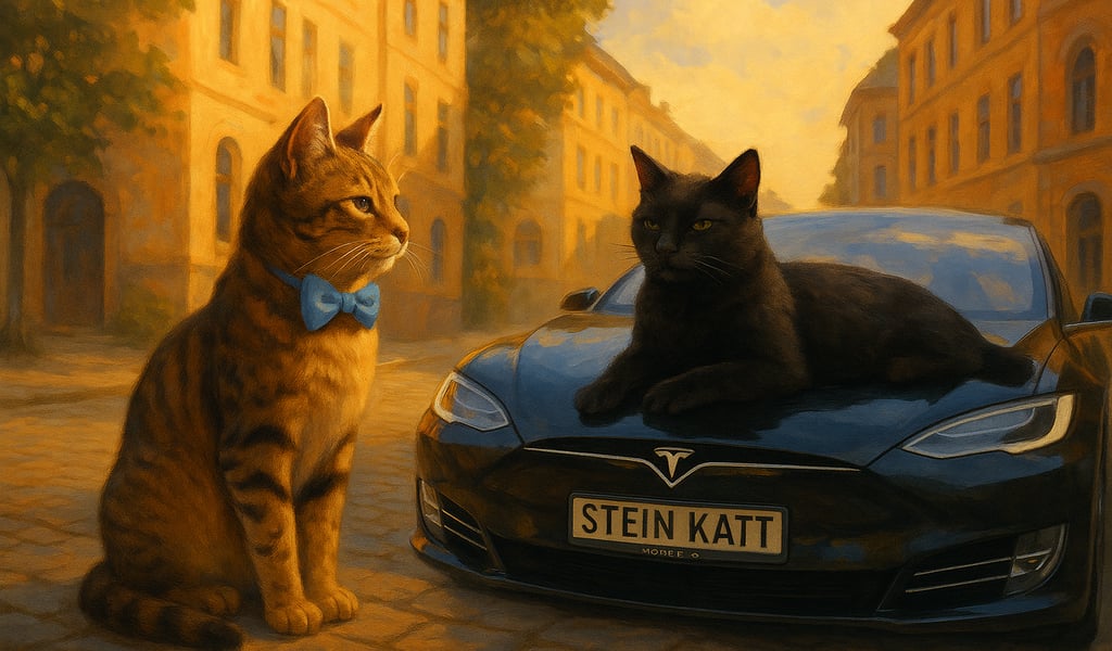 «Tja, det er ikke vanskelig,» svarte Stein mens han strakte på ryggen. «Man må bare være tidlig ute. Oldefaren min – som også het Stein – var den første katten som markerte territoriet ved Stensparken, og etter ham ble parken oppkalt. Morgenstund har gull i munn, sant? Om morgenen har man et rikt utvalg – både territorier og biler. Folk som ikke kjører på jobb lar dem stå parkert, og når de drar, markerer jeg dem som mine. Når de kommer tilbake… vel, da er det for sent. Så enkelt er det. Du velger det du vil ha: en Tesla, en Ferrari, eller hvorfor ikke bare en Volvos panser å ligge på og nyte været… til det skifter.»